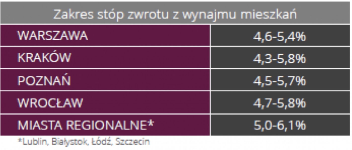 [1] Stopa zwrotu z wynajmu została obliczona jako relacja rocznego dochodu możliwego do uzyskania z wynajmu nieruchomości do ceny transakcyjnej mieszkań, w ośmiu polskich miastach. Przyjęty model uwzględniał szacunkowy koszt opłat administracyjnych w poszczególnych lokalizacjach, zryczałtowany podatek od przychodów z wynajmu w wysokości 8,5% oraz straty w dochodach związanej z 1,5-miesięcznym okresem przeznaczonym na poszukiwanie nowego najemcy.