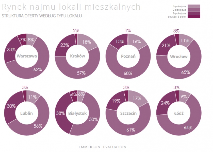Eksperci Emmerson Evaluation dokonali także analizy rynku najmu nowych mieszkań (oddanych do użytku w latach 2014-2016) w wybranych miastach pod względem liczby pokoi. Wyniki jasno wskazują, że zdecydowanie dominuje tam najem mieszkań 2-pokojowych. Takie lokale stanowią zwykle ponad połowę wynajmowanych, przy czym ich udział waha się od 50% w Białymstoku do nawet 68% w Poznaniu. W drugiej kolejności wynajmowane są mieszkania 3-pokojowe, które największą popularnością cieszą się w miastach Wschodniej Polski – Białymstoku (38%) i Lublinie (30%). Wśród analizowanych lokalizacji tylko w Poznaniu minimalną przewagę nad nimi uzyskały kawalerki (16%).