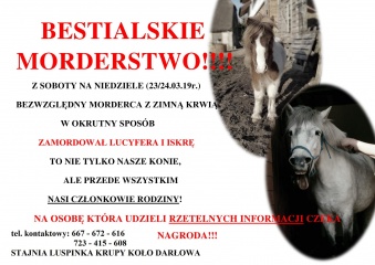 Uważa, że Lucyfera oraz Iskrę, członków jej rodziny, ktoś w bestialski sposób zamordował. Dlatego za informację, która pomoże odnaleźć sprawców wyznaczono nagrodę. Wszelkie informacje można zgłaszać pod numer tel. 667 672 616 lub 723 425 608.