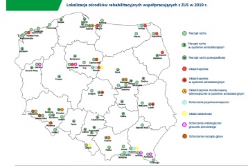 Zakład Ubezpieczeń Społecznych prowadzi rehabilitację w prawie 100 ośrodkach, m.in. w Augustowie, Ciechocinku, Krynicy, Nałęczowie, czy Kołobrzegu. W tym roku zaplanowane jest podpisanie umów z kolejnymi placówkami. W II kwartale ruszy konkurs na wybór ośrodków, które będą realizowały m.in. wczesną rehabilitację powypadkową. W ramach rehabilitacji Zakład gwarantuje pięć lub nawet sześć zabiegów leczniczych dziennie.