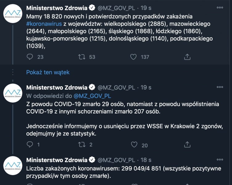 Ministerstwo Zdrowia poinformowało o kolejnych 18 820 osobach zarażonych wirusem SARS-CoV-2. W Koszalinie i powiecie 82 osoby.