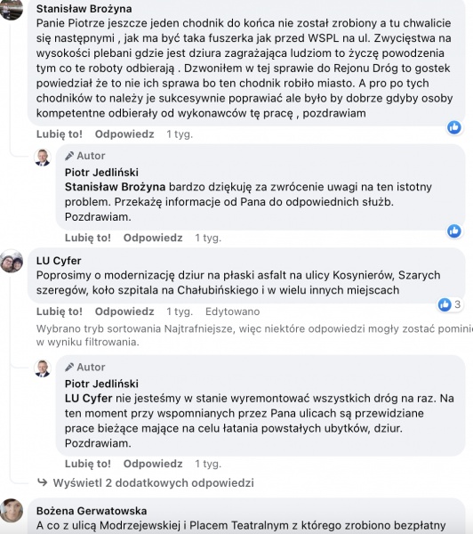 Pod koniec marca prezydent Koszalina, Piotr Jedliński publikując na swoim fanpejdżu wpis o ogłoszeniu przetargów na remonty kolejnych chodników (przy ul. Projektantów,ul. Budowniczych, wzdłuż ul. Krzyżanowskiego 2 a-d, budynku ul. Kostenckiego 2-4d) z dumą zapowiedział, że "koszalińskie osiedla nabiorą nowego kształtu. To początek nowych inwestycji". No i zaczęło się. Pod prezydencką informacją mieszkańcy miasta zamieścili wpisy o aktualnym stanie chodników, z których na co dzień korzystają. Oto tylko fragment zamieszczonych uwag: