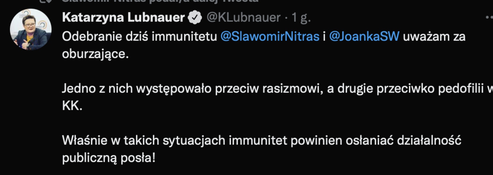 Sejm uchylił w czwartek immunitet Sławomirowi Nitrasowi (KO); możliwości pociągnięcia posła do odpowiedzialności karnej domagał się oskarżyciel prywatny Marek Palarczyk. To były działacz Kukiz'15, którego Nitras oskarżył o chodzenie po Sejmie w koszulce z rasistowskimi napisami. Za uchyleniem immunitetu Nitrasowi zagłosowało 231 posłów, 217 było temu przeciwnych, a jedna osoba wstrzymała się od głosu.