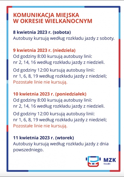 Od godziny 8:00 kursują autobusy linii: nr 2, 14, 16 według rozkładu jazdy z niedzieli.