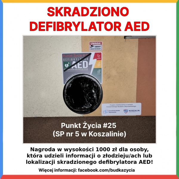 Złodziejowi / złodziejom może grozić do pięciu lat więzienia za kradzież defibrylatora AED.