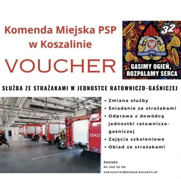 Voucher obejmuje wizytę w wyznaczonej jednostce ratowniczo-gaśniczej, w uzgodnionym terminie, w godzinach 7:30-15:30. Wizyta obejmuje udział w następujących elementach z rozkładu służby: