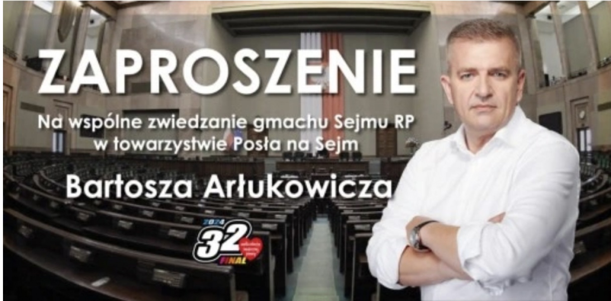 Przedmiotem licytacji jest zaproszenie na wspólne zwiedzanie gmachu Sejmu RP w towarzystwie Posła na Sejm Bartosza Arłukowicza. Wspólne zwiedzanie zakamarków sejmowych zakończymy uroczystym obiadem. Termin spotkania uzgodnimy po zakończeniu aukcji. Koszt dojazdu do Warszawy we własnym zakresie.