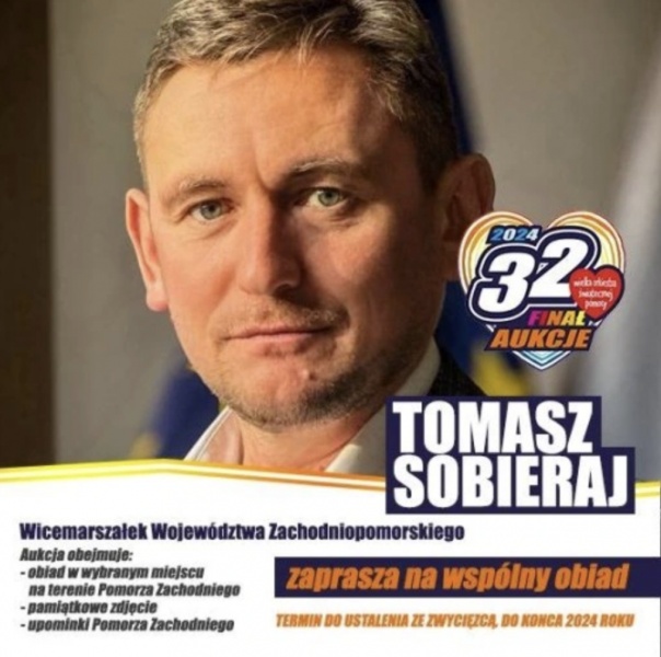 Przedmiotem licytacji jest zaproszenie na obiad z Wicemarszałekiem Województwa Zachodniopomorskiego Panem Tomaszem Sobierajem.