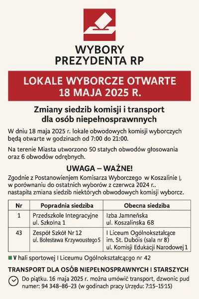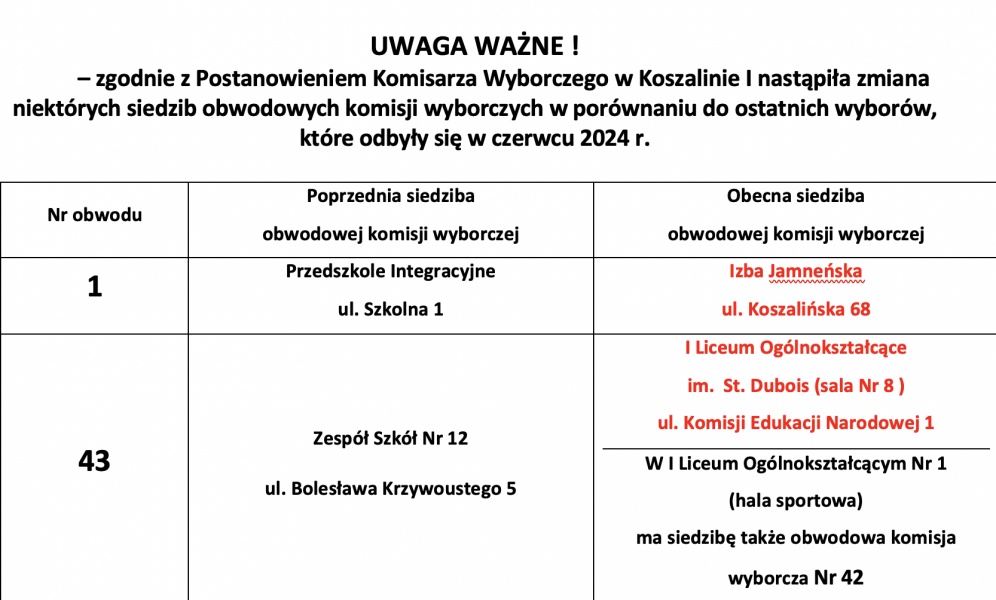 W tym roku nastąpiła zmiana lokalizacji dwóch siedzib obwodowych komisji wyborczych. Prosimy wszystkich wyborców o dokładne zapoznanie się z nowymi adresami, aby uniknąć nieporozumień w dniu głosowania.