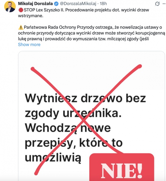 Zaznaczył przy tym, że konieczne są nowe, bezpieczne przepisy, które usprawnią postępowania administracyjne, ale nie otworzą furtki dla niekontrolowanej wycinki.