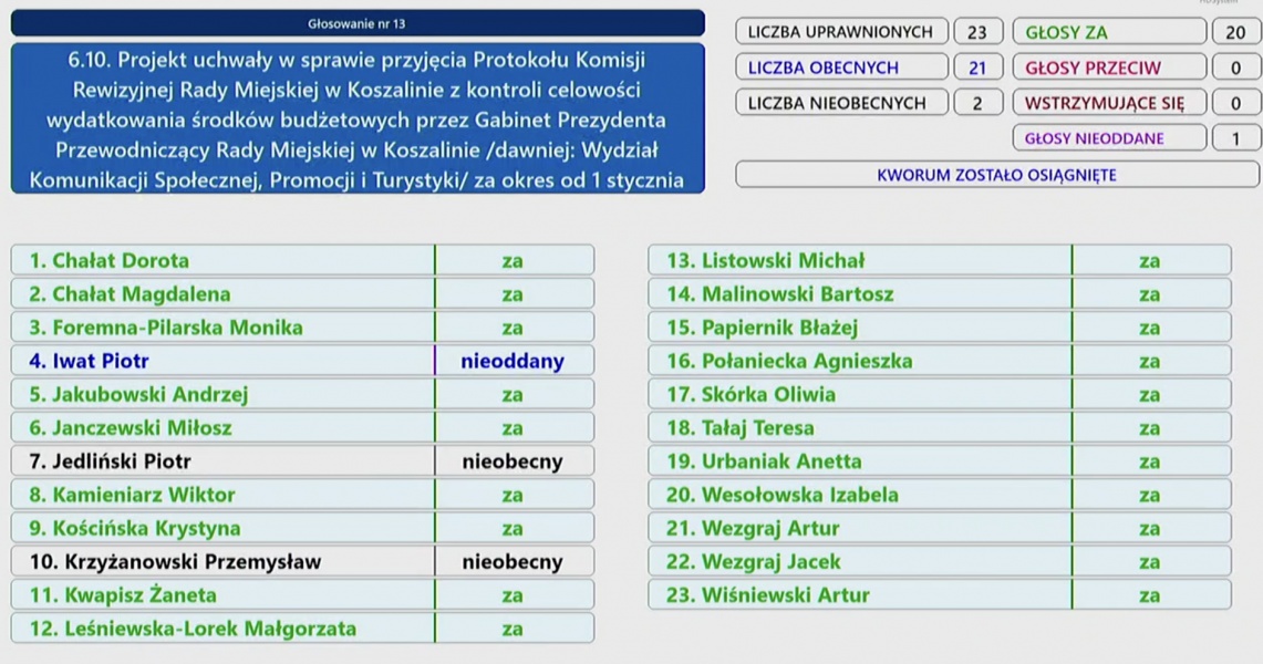 – Musieliśmy przebrnąć przez ogrom dokumentów – potwierdzał radny Błażej Papiernik, który przedstawił kilka pokontrolnych wniosków. Najważniejsze z nich to przejrzystość i jeden schemat rozliczeń, proporcje między mediami, analiza skuteczności kampanii itd. Magdalena Chałat wspomniała o „forowaniu jednego medium” i „nadużywaniu funkcji”. Sprawiedliwość, ale z indeksami medialnymi. Poprosimy radnych o upublicznienie tego protokołu... Tu ważne: Jedliński głosowania odmówił – kontrola dotyczyła czasu gdy był prezydentem. Nie chciał głosować we własnej sprawie.