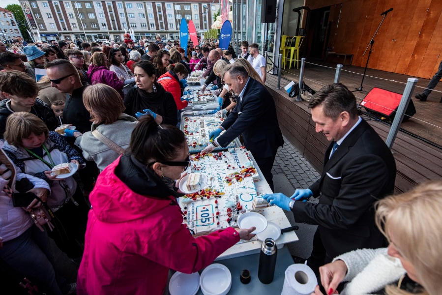 Tradycyjnie wszystko zaczęło się od wspólnego krojenia urodzinowego tortu, który przygotowały cztery koszalińskie cukiernie. Mieszkańcy ustawili się w długiej kolejce, by wspólnie uczcić ten wyjątkowy dzień. Przed pierwszym odkrojeniem słodkości, życzenia mieszkańcom złożyli m.in. prezydent Koszalina Tomasz Sobieraj oraz marszałek województwa Olgierd Geblewicz.