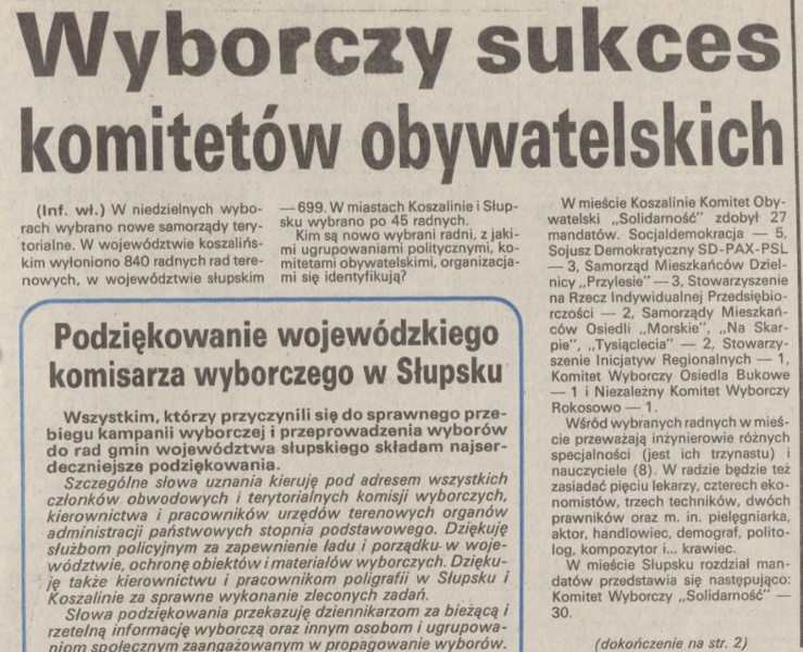 W koszalińskich wyborach samorządowych 1990 roku największe poparcie zdobył Komitet Obywatelski "Solidarność", który uzyskał 27 mandatów, co dało mu pozycję dominującą w nowo powstałej radzie miasta. Drugą siłę stanowiła Socjaldemokracja, zdobywając 5 mandatów, a tuż za nią uplasował się Sojusz Demokratyczny SD-PAX-PSL z 4 mandatami. W wyborach silnie zaznaczyły swoją obecność także lokalne inicjatywy obywatelskie i społeczne. Samorząd Mieszkańców Dzielnicy „Przylesie” zdobył 3 mandaty, Stowarzyszenie na Rzecz Indywidualnej Przedsiębiorczości – 2, a Samorządy Mieszkańców Osiedli „Morskie”, „Na Skarpie”, „Tysiąclecia” – również 2. Po jednym przedstawicielu w radzie miały: Stowarzyszenie Inicjatyw Regionalnych, Komitet Wyborczy Osiedla Bukowe oraz Niezależny Komitet Wyborczy „Rokosowo”.