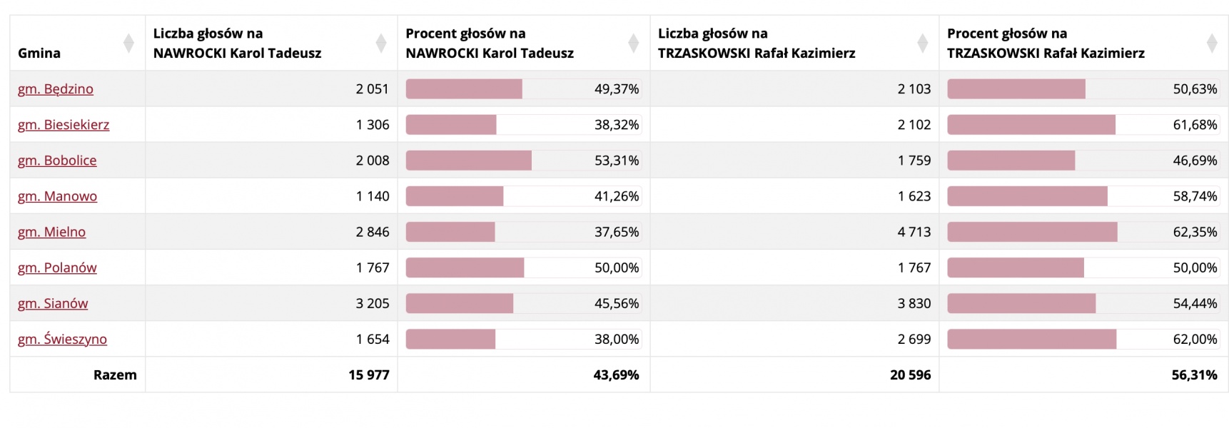 W powiecie koszalińskim również wygrał Rafał Trzaskowski, choć przewaga była skromniejsza – zdobył około 52,4% głosów, podczas gdy Karol Nawrocki uzyskał 47,6%. W mniejszych gminach, takich jak Będzino czy Manowo, kandydat PiS cieszył się większym poparciem, ale nie wystarczyło to do przechylenia szali zwycięstwa na poziomie całego powiatu.