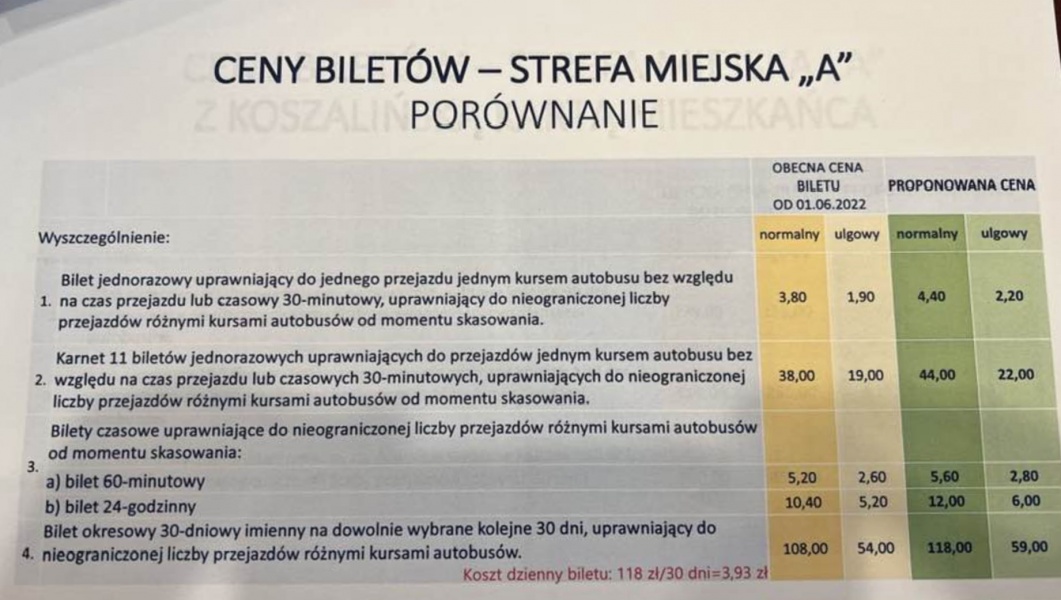 Zgodnie z przedstawioną propozycją prezesa MZK Koszalin, Piotra Rowińskiego, cena biletu normalnego jednorazowego lub 30-minutowego miałaby wzrosnąć z 3,80 zł do 4,40 zł, a bilet miesięczny zdrożałby o 10 zł. Jednocześnie spółka nie planuje zmian w cenach biletów długoterminowych dla posiadaczy Koszalińskiej Karty Mieszkańca – te mają pozostać na dotychczasowym poziomie.