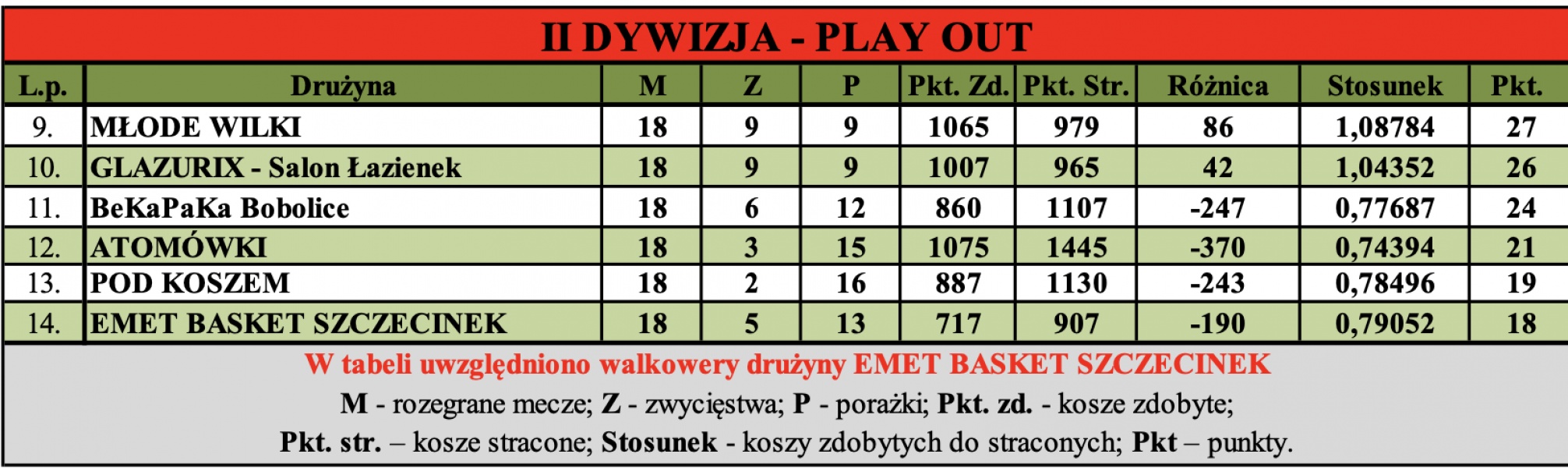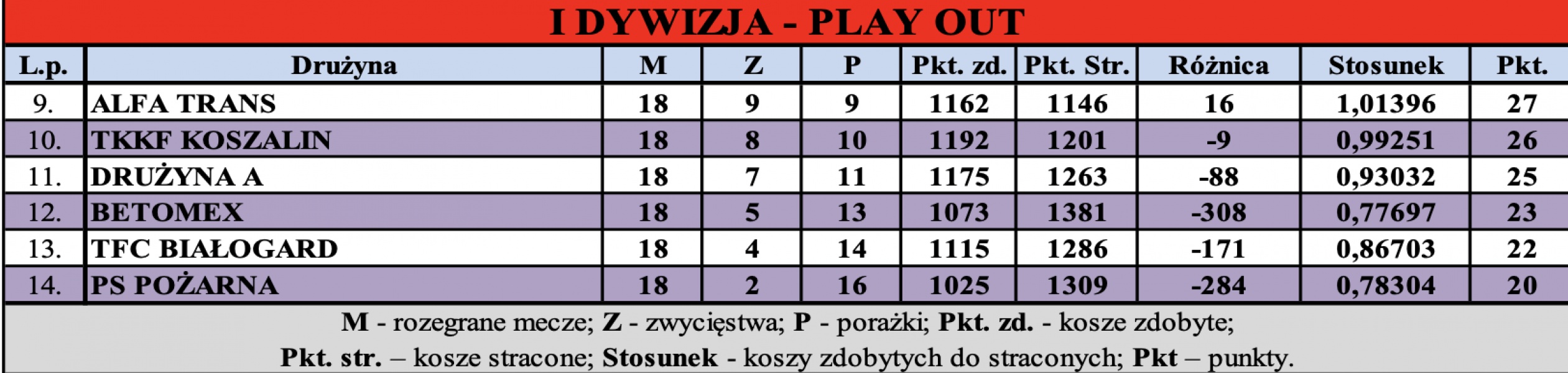 W I Dywizji 7 miejsce należy do LKS Bonin, który w drugim meczu z Kontrabandą utrzymał przewagę z pierwszego meczu i spokojnie bez przygód mógł świętować zwycięstwo w dwumeczu. Tartak Sekwoja zagrał o 5 miejsce z MKS Kosz Białogard i musiał odrobić 23 punktową stratę z pierwszego meczu i niestety, ale się nie udało i piąte miejsce zajął beniaminek z Białogardu! W play out TKKF Koszalin przegrało z PS Pożarną 68-77, po meczu w którym nikt niczego nie musiał, ale oba zespoły i tak zagrały fajny do oglądania pojedynek. Alfa Trans na pożegnanie sezonu pokonała 70-65 Drużynę A. Mecz w wykonaniu obu zespołów był pojedynkiem otwartym, w którym każdy wynik był możliwy i dopiero ostatnia kwarta zdecydowała o zwycięstwie Alfa Trans.