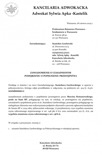 Zawiadomienie dotyczy fałszywego oskarżenia, jakiego Romanowski miał się dopuścić wobec Gawłowskiego, informując organy ścigania o rzekomym przestępstwie polegającym na nielegalnym zbieraniu podpisów poparcia w trakcie kampanii wyborczej do Senatu RP w 2019 roku.