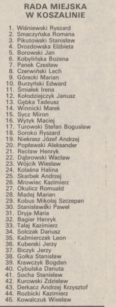 W symbolicznej sesji zasiadło kilkudziesięciu z 45 ówczesnych radnych. Nie wszyscy mogli dojechać do Koszalina, innych już pożegnaliśmy... W wyborach samorządowych w 1990 roku największe poparcie zdobył Komitet Obywatelski „Solidarność”, uzyskując 27 mandatów, co zapewniło mu pozycję dominującą w nowo powstałej radzie. Drugą siłę stanowiła Socjaldemokracja z 5 mandatami, a kolejne miejsca zajęły Sojusz Demokratyczny SD-PAX-PSL (4 mandaty), Samorząd Mieszkańców Dzielnicy „Przylesie” (3 mandaty), Stowarzyszenie na Rzecz Indywidualnej Przedsiębiorczości (2 mandaty), a także komitety osiedlowe „Morskie”, „Na Skarpie”, „Tysiąclecia” (po 2 mandaty). W radzie znaleźli się również przedstawiciele Stowarzyszenia Inicjatyw Regionalnych, Komitetu Wyborczego Osiedla Bukowe oraz Niezależnego Komitetu Wyborczego „Rokosowo”. Skład Rady: