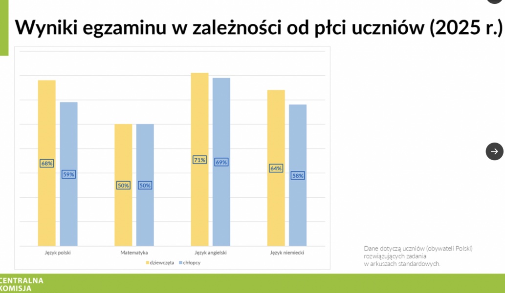 Tegoroczny egzamin ósmoklasisty w Polsce przyniósł wyniki na poziomie: polski 64 %, matematyka 50 %, angielski 70 %.