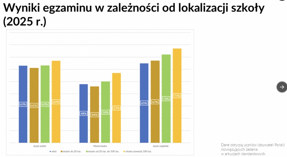 Tymczasem uczniowie z mniejszych miejscowości osiągali gorzej – np. w małych miastach ~61 % z polskiego i ~46 % z matematyki; na wsiach angielski na poziomie ~65 %