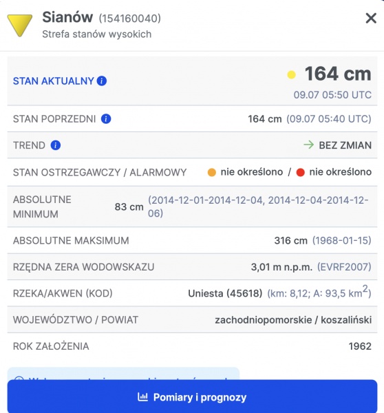 Tychówko — stan wody: 148 cm (stan ostrzegawczy: 320 cm, stan alarmowy: 380 cm).