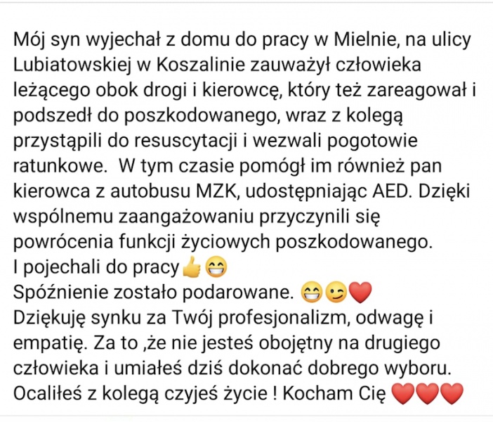 W akcji wsparł ich Ireneusz Czesnowski, kierowca autobusu linii nr 2, który dostarczył defibrylator AED znajdujący się na pokładzie pojazdu.