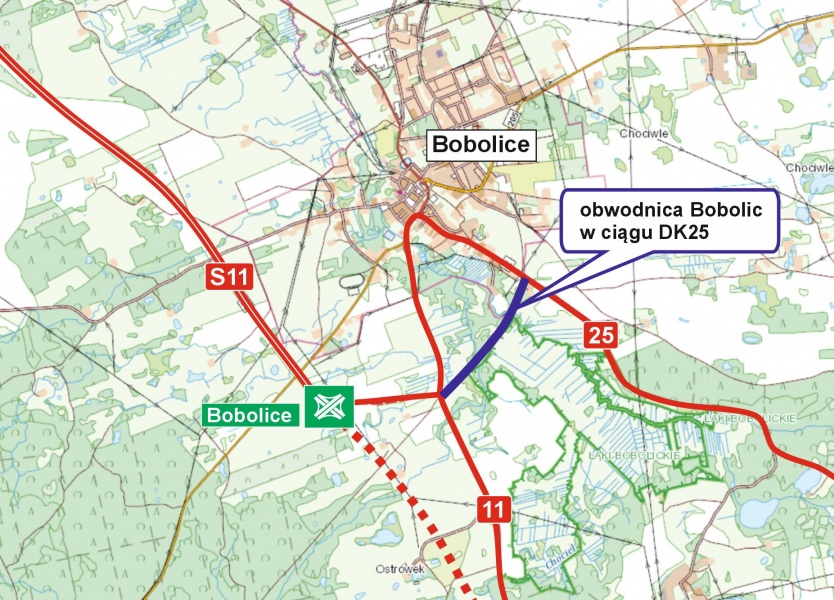 Nadal jednak przez centrum miasta prowadzi DK25, biegnąca od Bydgoszczy przez Człuchów i Biały Bór. Aby wjechać na S11 i kontynuować podróż na północ, kierowcy muszą obecnie cofać się przez miasto do węzła Bobolice. Nowa obwodnica w ciągu DK25 pozwoli wyprowadzić cały ruch tranzytowy z miasta i skróci dojazd z obecnych 2,3 km przez centrum do 1,1 km nową trasą.