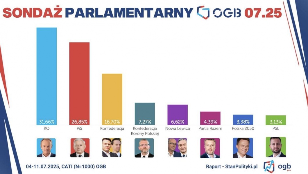 Na Koalicję Obywatelską w lipcu 2025 roku zagłosowałoby 31,66 proc. uczestników sondażu przeprowadzonego przez Ogólnopolską Grupę Badawczą (OGB). Partia Donalda Tuska umacnia swoją pozycję jako samodzielny lider. Na drugim miejscu znalazło się Prawo i Sprawiedliwość, które zdobyło 26,85 proc. głosów — to spadek o 7 pkt proc. w porównaniu z poprzednimi miesiącami. Podium zamyka Konfederacja, popierana przez 16,7 proc. ankietowanych.