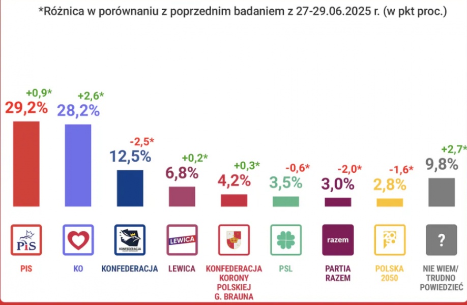 Według przeliczenia na mandaty, Koalicja Obywatelska miałaby w Sejmie 175 posłów (obecnie 157). Prawo i Sprawiedliwość mogłoby liczyć na 153 mandaty (w 2023 roku partia zdobyła 194), a Konfederacja — aż 84 miejsca (dziś ma 18). Konfederacja Korony Polskiej zdobyłaby 28 mandatów, a Nowa Lewica 20 (obecnie 26).