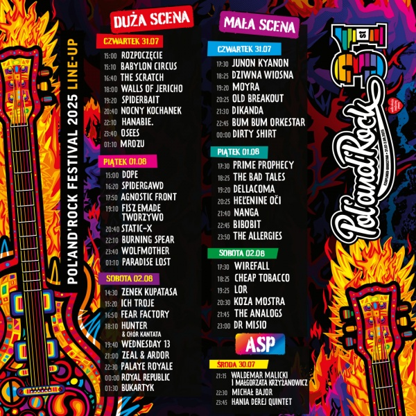W 2025 roku na Dużej Scenie zobaczymy m.in. legendy metalu (Paradise Lost, Fear Factory), gwiazdy rocka (Wolfmother, Agnostic Front) czy polskie kultowe grupy (jubileusz Huntera, finałowy koncert Ich Troje ze Złotym Bączkiem).