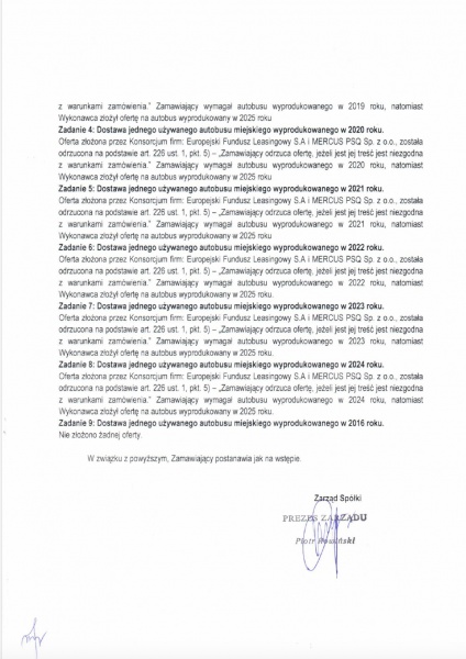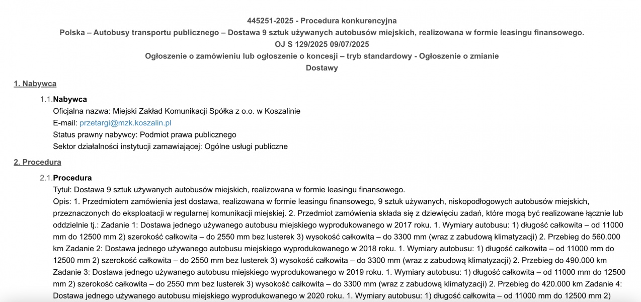 Przetarg ogłoszony 3 czerwca 2025 r. dotyczył leasingu 9 używanych autobusów miejskich, po jednym z każdego rocznika od 2016 do 2024. Wśród nich planowano osiem standardowych autobusów 12-metrowych oraz jeden autobus przegubowy o długości około 18 metrów