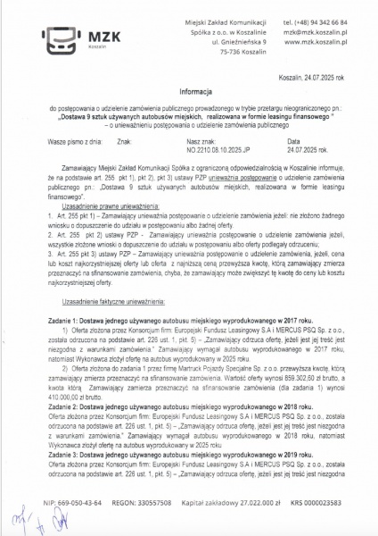 24 lipca 2025 roku MZK Koszalin oficjalnie unieważnił całe postępowanie, korzystając z podstaw prawnych przewidzianych w art. 255 pkt 1), 2) i 3) ustawy Prawo zamówień publicznych. W uzasadnieniu wskazano następujące powody unieważnienia przetargu