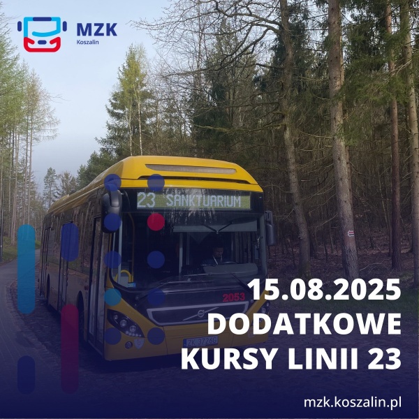 Miejski Zakład Komunikacji informuje, że w piątek 15 sierpnia 2025 r., w Święto Wniebowzięcia Najświętszej Maryi Panny, oprócz standardowych kursów linii nr 23 uruchomione zostaną dodatkowe połączenia: 10:05 – wyjazd z Osiedla Bukowe i 13:40 – wyjazd z Sanktuarium.