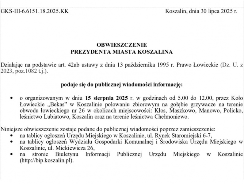 Obwieszczenie o polowaniu zostało opublikowane przez Prezydenta Miasta Koszalina w Biuletynie Informacji Publicznej oraz na tablicach ogłoszeń Urzędu Miejskiego i Wydziału Gospodarki Komunalnej i Środowiska.