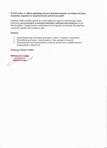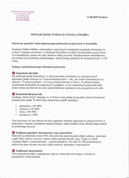 Natychmiastowego odwołania polowania w dniu 15 sierpnia w Koszalinie.