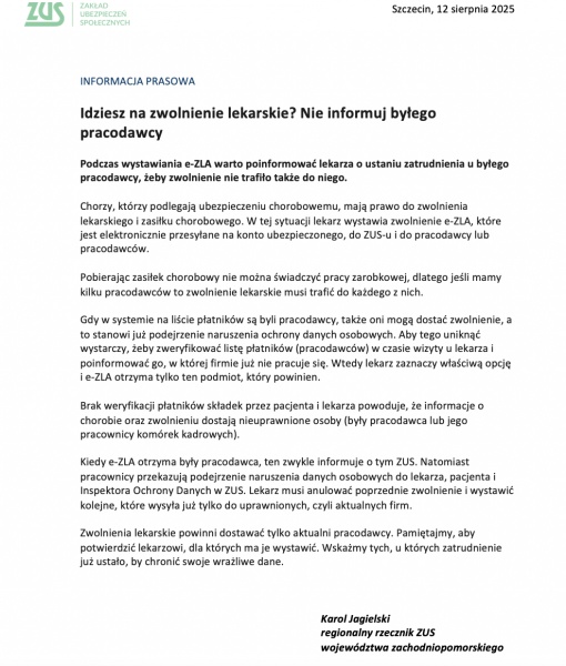 Gdy w systemie na liście płatników są byli pracodawcy, także oni mogą dostać zwolnienie, a to stanowi już podejrzenie naruszenia ochrony danych osobowych. Aby tego uniknąć, wystarczy, żeby zweryfikować listę płatników (pracodawców) w czasie wizyty u lekarza i poinformować go, w której firmie już nie pracuje się. Wtedy lekarz zaznaczy właściwą opcję i e-ZLA otrzyma tylko ten podmiot, który powinien.