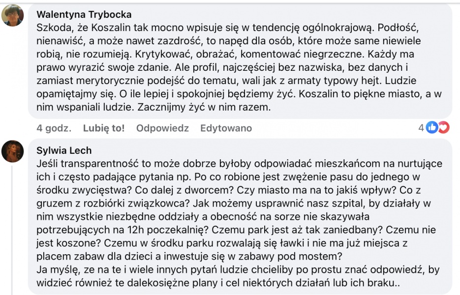 Efekt? Mieszkańcy, choć mimowolnie wciągani w tę burzę, pytają o sprawy bardziej przyziemne: dworzec, park, szpital, śmietniki, bezpieczeństwo. Jedni apelują o mniej jadu i więcej współpracy, inni chcą prostych odpowiedzi na proste pytania. Bo ile razy można słuchać o „układach”, skoro w parku rozkładają się ławki, a dworzec cały czas straszy?