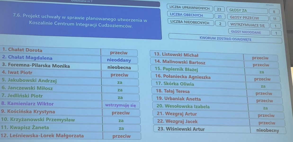 Zdecydowane stanowisko zajął Andrzej Jakubowski (PiS): – Dziwię się, że ktoś jest przeciw tej uchwale. Ja jestem przeciw powstaniu CIC w Koszalinie. Jacek Wezgraj oświadczając wprost nie zostawił suchej nitki na projekcie uchwały: - To haniebna gra na strachu. Projekt był oparty o zmanipulowane dane, fałszywe przesłanki oraz teorie spiskowe. Autorzy nie zadali sobie nawet trudu, by sensownie go uzasadnić – całe uzasadnienie to zaledwie kilka zdań. CIC nie są projektem miejskim – nie mamy wpływu na ich powstanie lub brak. Informacje o ich funkcjonowaniu są powszechnie dostępne. To wsparcie dla osób przebywających legalnie: nauka języka, pomoc psychologiczna, pomoc w formalnościach. Chcę, aby Koszalin był miastem, w którym odnajdzie się każda osoba, niezależnie od pochodzenia. Granie na lękach, strachach i paranoicznych teoriach spiskowych jest haniebne.
