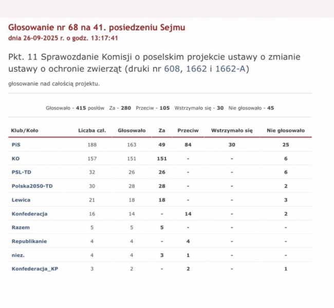 Jak głosowali posłowie z naszego regionu - PiS: Czesław Hoc - wstrzymał się od głosy, Małgorzata Golińska i Marek Subocz przeciw, Radosław Lubczyk (PSL) i Barbara Grygorcewicz (KO) - za. Ta decyzja zapisze się w pamięci – nie tylko obrońców praw zwierząt, ale wszystkich, którzy wierzą w podstawowe wartości: empatię, współczucie i odpowiedzialność.