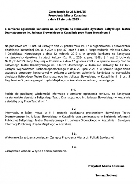 Bałtycki Teatr Dramatyczny im. Juliusza Słowackiego w Koszalinie będzie miał nowego dyrektora. Miasto ogłosiło zamiar przeprowadzenia konkursu, ponieważ trzyletnia kadencja obecnego dyrektora Andrzeja Mielcarka kończy się wraz z sezonem artystycznym 2025/2026.