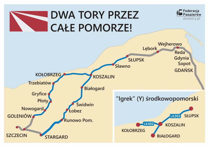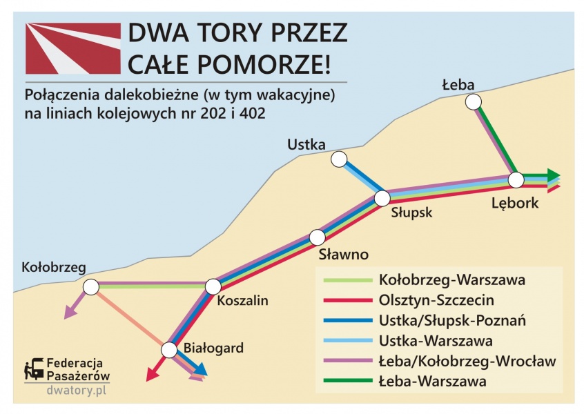 „Na tym odcinku kumuluje się ruch pociągów dalekobieżnych kilku relacji, regionalnych i towarowych. Ograniczona przepustowość sprawia, że pociągi jadą dłużej, bo muszą stać na stacjach, aby przepuścić składy jadące z przeciwka” - przekonują inicjatorzy kampanii „Dwa tory przez całe Pomorze”.