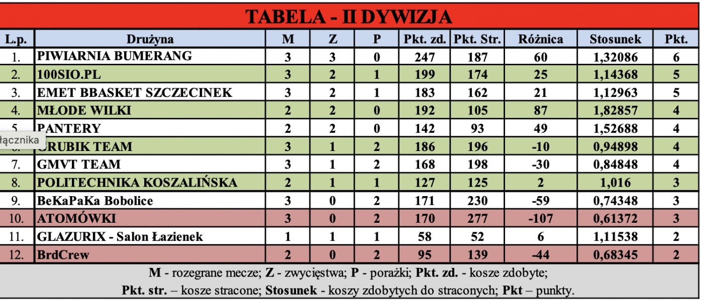 W II Dywizji GMVT Team pokonał Atomówki 76-45, które próbowały ambitnie walczyć, ale przewaga fizyczna rywali wzięła górę. Politechnika Koszalińska po ciekawym meczu uległa rutynowanej drużynie 100SIO.PL 54-61, Niestety dwóch zawodników meczu nie wygra, a spokój