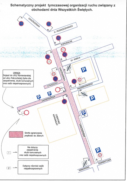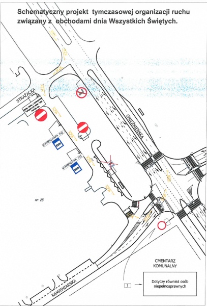 Wjazd autobusów w rejon cmentarza odbywać się będzie ul. Strażacką, gdzie zostaną utworzone tymczasowe przystanki dla wysiadających i wsiadających pasażerów.