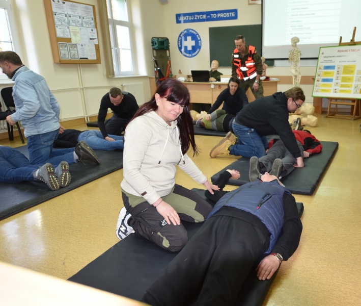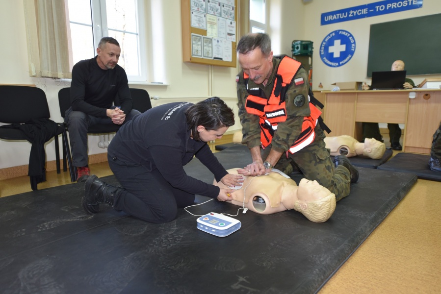 Część medyczna skupiała się na najważniejszych czynnościach ratujących życie: ocena poszkodowanego, tamowanie krwotoków, urazy, hipotermia, opatrywanie ran oraz procedury alarmowania służb.