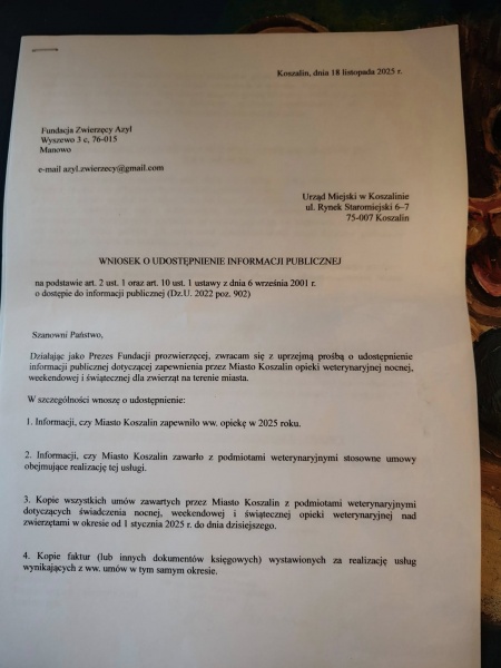 Fundacja „Zwierzęcy Azyl” z Wyszewa poinformowała, że wystosowała oficjalny wniosek do Urzędu Miasta dotyczący funkcjonowania opieki weterynaryjnej w weekendy oraz dni świąteczne. Organizacja twierdzi, że w miniony weekend dyżur weterynaryjny nie działał wcale, a problem – według sygnałów, które otrzymała – miał pojawiać się również wcześniej.