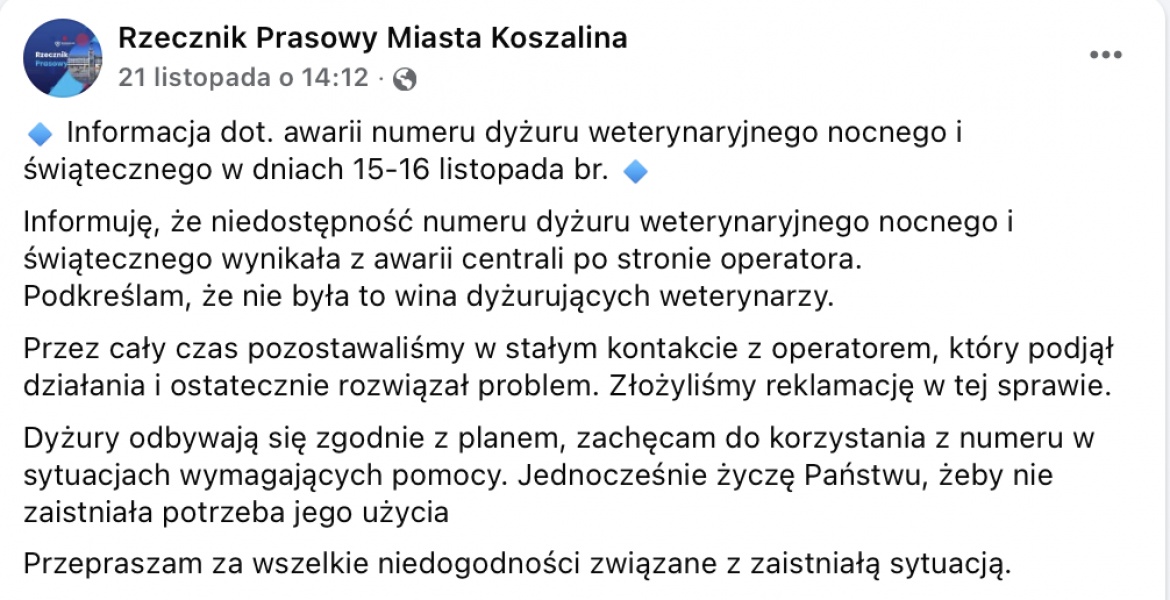 – Niedostępność numeru dyżuru weterynaryjnego nocnego i świątecznego wynikała z awarii centrali po stronie operatora. Nie była to wina dyżurujących weterynarzy. Pozostawaliśmy w stałym kontakcie z operatorem, który podjął działania i rozwiązał problem. Została też złożona reklamacja – podaje rzecznik.