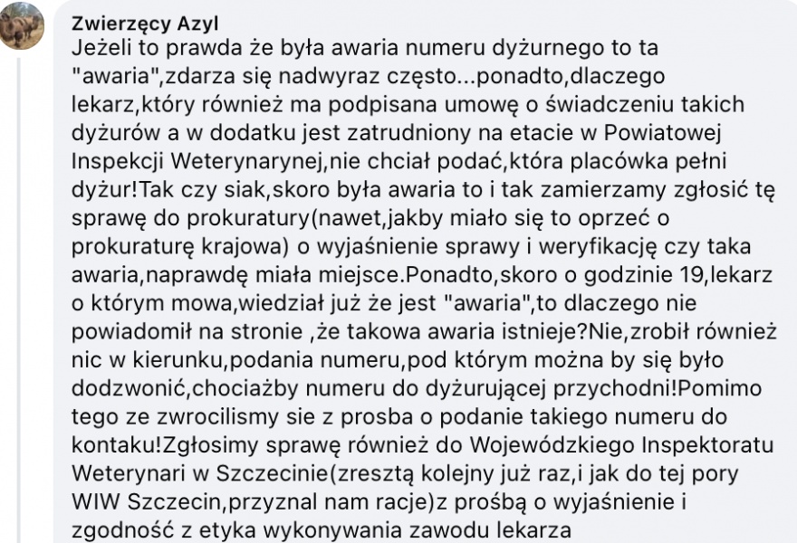 W związku z licznymi zgłoszeniami i wątpliwościami „Zwierzęcy Azyl” zapowiada skierowanie sprawy do prokuratury oraz ponowne zgłoszenie jej do Wojewódzkiego Inspektoratu Weterynarii w Szczecinie, który – jak podkreśla organizacja – „wcześniej przyznał jej rację w podobnych sprawach”.