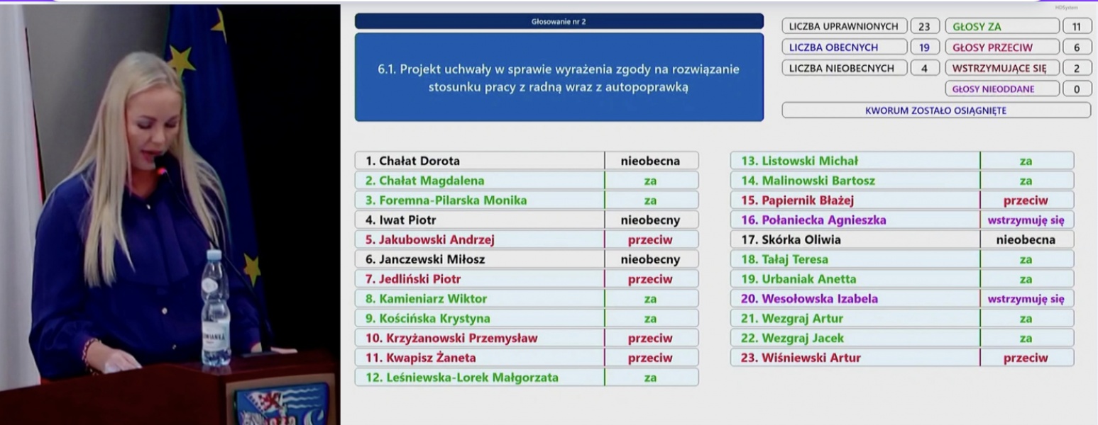 Przypomnijmy, wniosek o zgodę na rozwiązanie umowy o pracę z radną wpłynął do Rady Miejskiej kilka miesięcy wcześniej. Zgodnie z ustawą o samorządzie gminnym, pracodawca nie może rozwiązać stosunku pracy z radnym bez zgody rady.