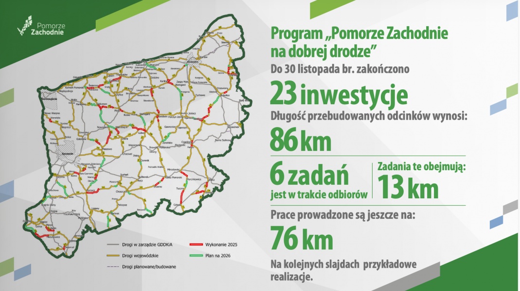 – Rok temu ogłosiliśmy program „Pomorze Zachodnie na dobrej drodze". Dzięki oszczędnościom udało się zrealizować więcej, niż planowaliśmy i dziś możemy to ogłosić – podkreśla Marszałek Województwa, Olgierd Geblewicz.