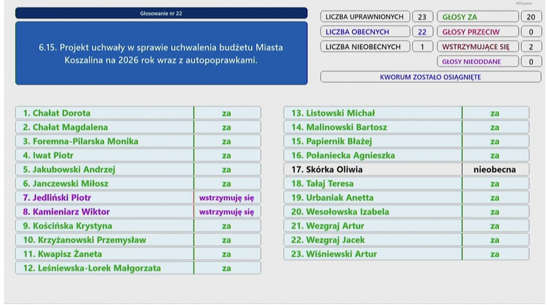 Dziś koszalińscy radni niemal jednogłośnie (przy dwóch głosach wstrzymujących się) przyjęli uchwałę zatwierdzającą przyszłoroczny budzę miasta. Budżet na 2026 rok dla Koszalina zakłada, że dochody miasta wyniosą 1 miliard 153 miliony 935 tysięcy złotych, natomiast wydatki zamkną się kwotą 1 miliard 193 miliony 170 tysięcy złotych. Deficyt wyniesie więc 39 milionów złotych.